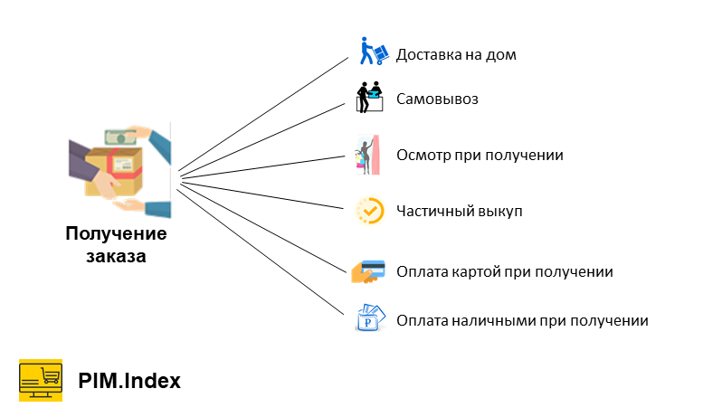 Группа «Получение заказа» включает в себя 6 параметров: доставка на дом, самовывоз, осмотр при получении, частичный выкуп заказа, оплата картой при получении, оплата наличными при получении. Эти сервисные услуги обеспечивают покупателям максимально комфортный пользовательский опыт во время получения заказов, будь то доставка «до двери» или самовывоз.