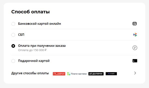 Наличие постоплаты снижает барьер для покупателей, оформляющих различные дорогие заказы. Соответственно, эта опция повышает конверсию покупок из корзины. А поскольку большая часть покупателей давно привыкла оплачивать покупки картами, то их прием нужно обеспечивать в первую очередь.